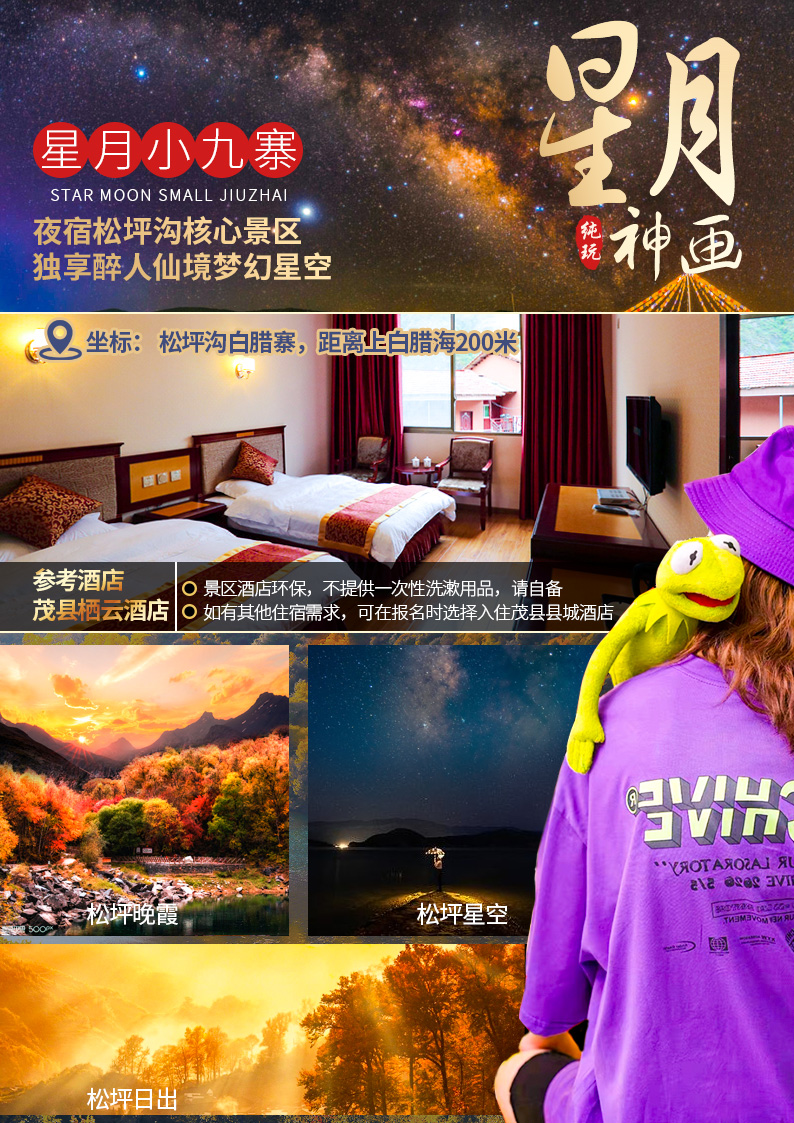 阿坝州沿线住宿硬件和软件条件都有限,请不要以城市的标准来衡量,敬请谅解!(为提倡绿色环保,酒店不提供一次性洗漱用品,游客需自备);当地宾馆大多为太阳能热水器,限时供应热水。以上报价均以一个床位计价,如游客人数为单数而又无法拼房,则需要补房差。法定节假日和红叶节期间住房紧张旅行社会调配住房,尽情谅解!