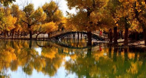 代表和典范,3 公里景观水系蜿蜒曲折,小桥、流水与胡杨完美融合,领略胡杨坚韧与柔情,