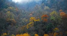 一样,由上至下,向下蔓延,深浅不一,层次分明,整个景区由红叶布景,红叶镶边在山顶。天气较好时,有幸可见云海、佛光